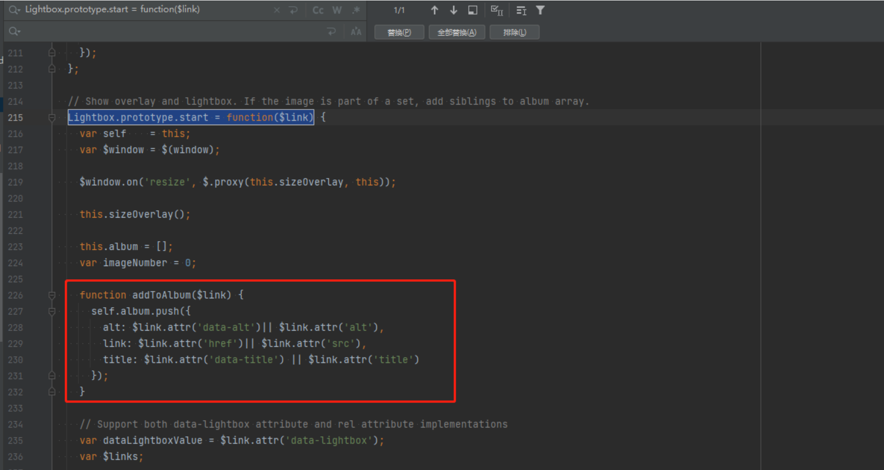 if (dataLightboxValue)(注释掉原有的,添加addToAlbum($link);):