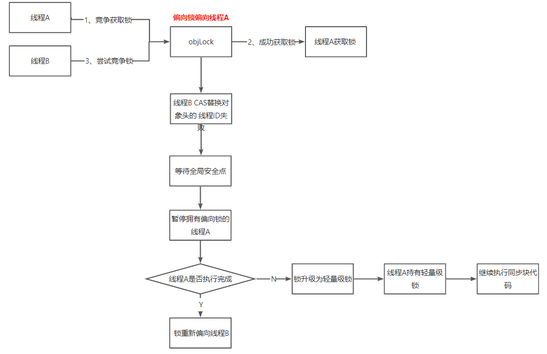 那么大部分情况下,不会涉及到偏向锁的撤销,当有另外的线程尝试竞争偏向锁的时候,这个时候才会涉及偏向锁的撤销流程。