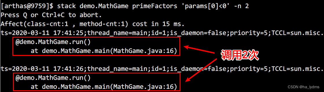 watch demo.MathGame primeFactors "{params,target,returnObj}" -x 2 -b -s -n 2